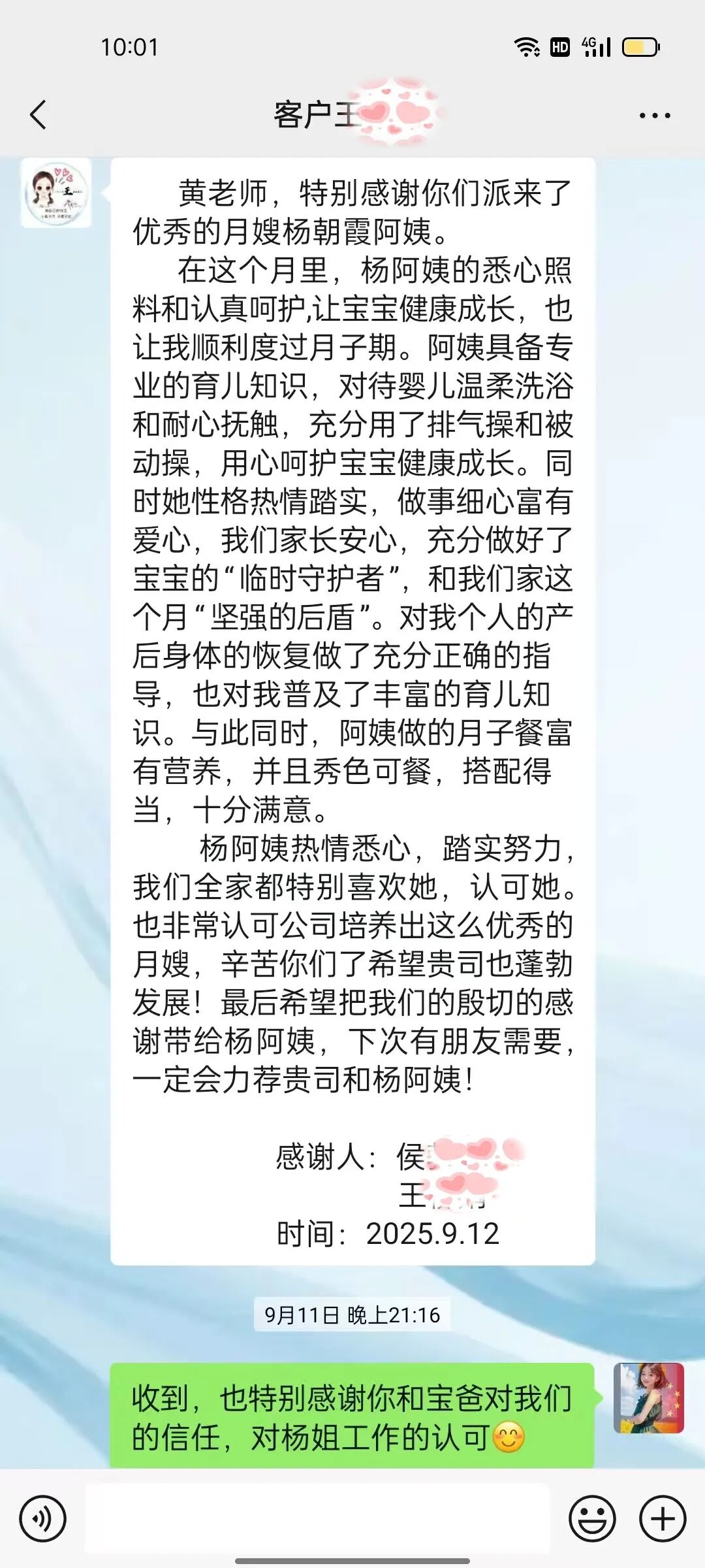 黄老师,特别感谢你们派来了优秀的月嫂杨朝霞阿姨。