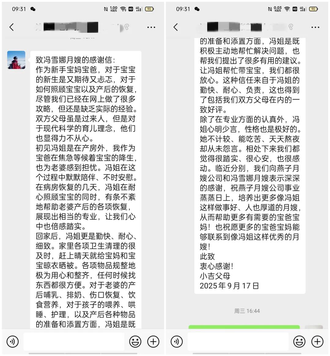 除了在专业方面的认真外,冯姐心明少言,性格也是极好的。她不计较、能吃苦、天天熬夜却从未怨言。相处下来我们都觉得很踏实、很心安,也很感动。临近分别,我们向燕子月嫂公司和冯雪娜月嫂表示深深的感谢,祝燕子月嫂公司事业蒸蒸日上,培养出更多像冯姐这样做事好、人也厚道的月嫂,从而帮助更多有需要的宝爸宝妈!也祝愿更多的宝爸宝妈能够联系到像冯姐这样优秀的月嫂!
