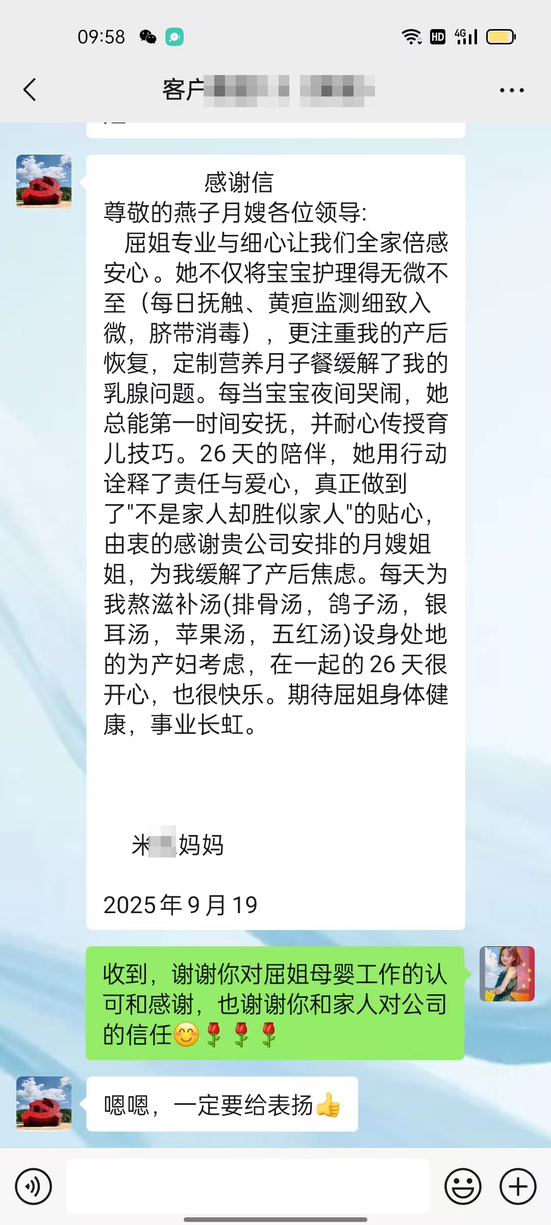 西安燕子月嫂屈姐的专业与细心让我们全家倍感安心