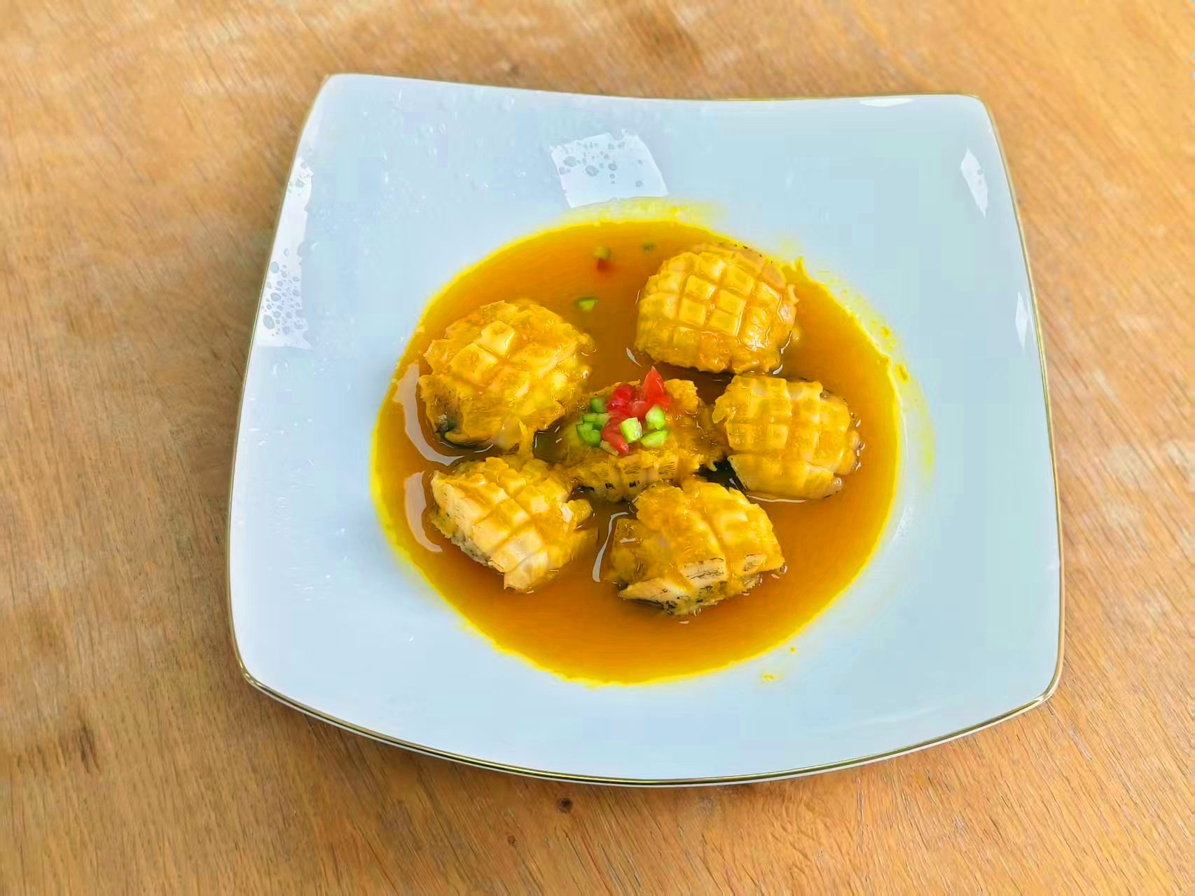 3、把完整的鲍鱼,切出十字花刀,放入盘中备用。