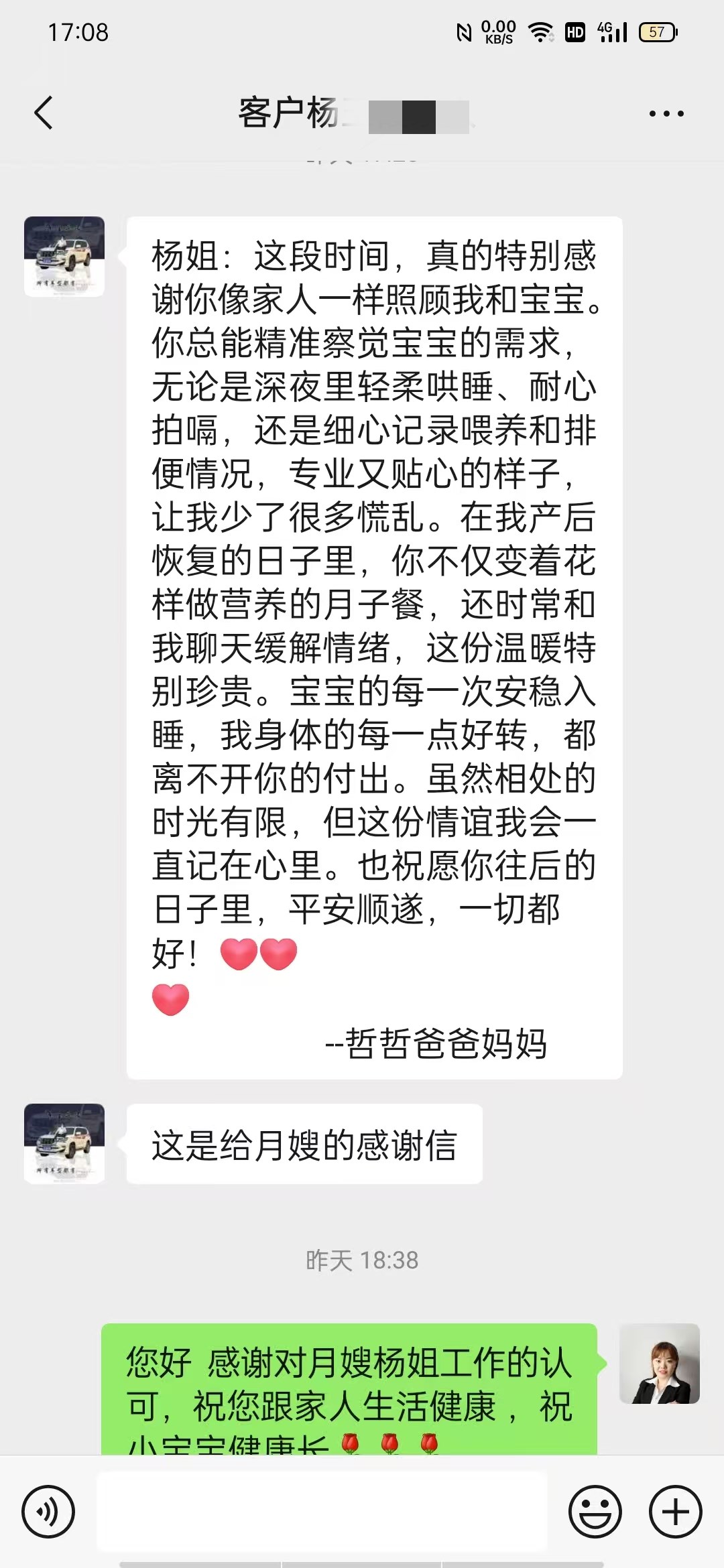 杨姐:这段时间,真的特别感谢你像家人一样照顾我和宝宝。你总能精准察觉宝宝的需求,无论是深夜里轻柔哄睡、耐心拍嗝,还是细心记录喂养和排便情况,专业又贴心的样子,让我少了很多慌乱。在我产后恢复的日子里,你不仅变着花样做营养的月子餐,还时常和我聊天缓解情绪,这份温暖特别珍贵。宝宝的每一次安稳入睡,我身体的每一点好转,都离不开你的付出。虽然相处的时光有限,但这份情谊我会一直记在心里。也祝愿你往后的日子里,平安顺遂,一切都好!