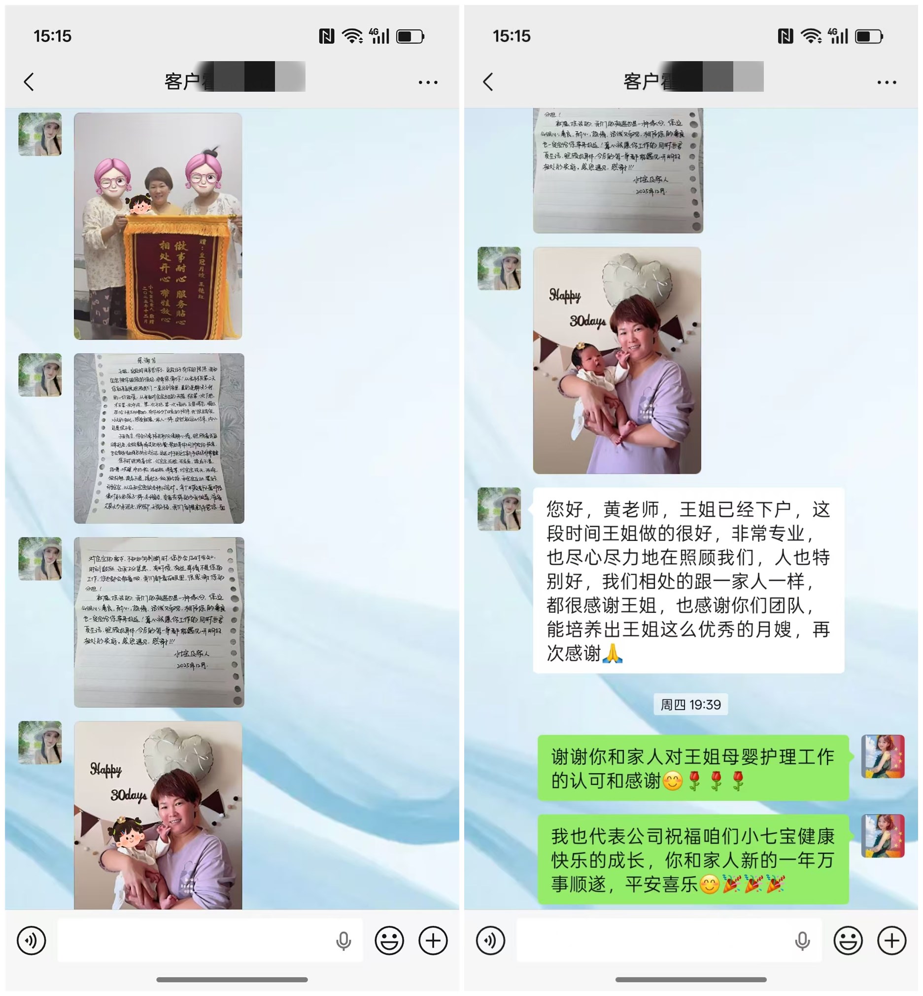 王姐,这段时间辛苦你了,这段日子有你的陪伴,我和宝宝被你照顾的很好,非常感谢你!从我手术后第二天您就来医院照顾我们,一直回到家里,真的是解决了我的一切困难,从我面对宝宝出生的无措,术后第一次下地,术后第一次冲洗,第一次开奶,第一次堵奶,反复哺乳,喂奶...您给了我太多帮助,有你多少日夜的陪伴,我很踏实,26天的相处,感觉就像一家人一样,突然就这儿结束,内心还是很不舍。