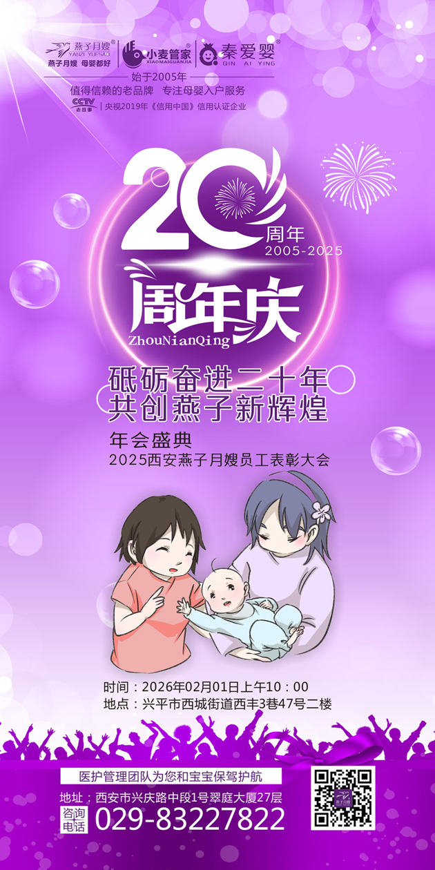 时光荏苒,步履铿锵。2025年,是西安燕子月嫂深耕母婴护理行业的第二十个年头。二十年风雨兼程,我们始终怀揣对生命的敬畏,以专业与爱守护万千家庭;二十年砥砺前行,每一位员工的汗水与智慧,共同铸就了“燕子月嫂”这块备受信赖的金字招牌。