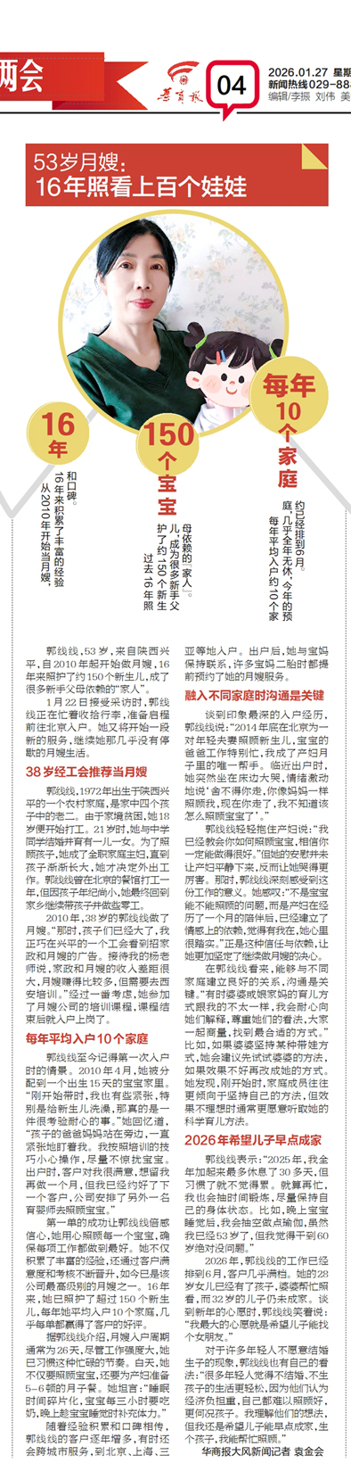 近日,《华商报》在“关注陕西两会”栏目中,用四分之一版报道了我西安燕子月嫂“私人订制”金牌月嫂郭线线老师的故事。53岁的她,来自陕西兴平,自2010年经由工会推荐进入行业,从第一次给新生儿洗澡时客户紧张的目光,到如今服务足迹遍及北京、上海、三亚,预约排期至半年后。她的故事,正是燕子月嫂无数优秀服务者的缩影。