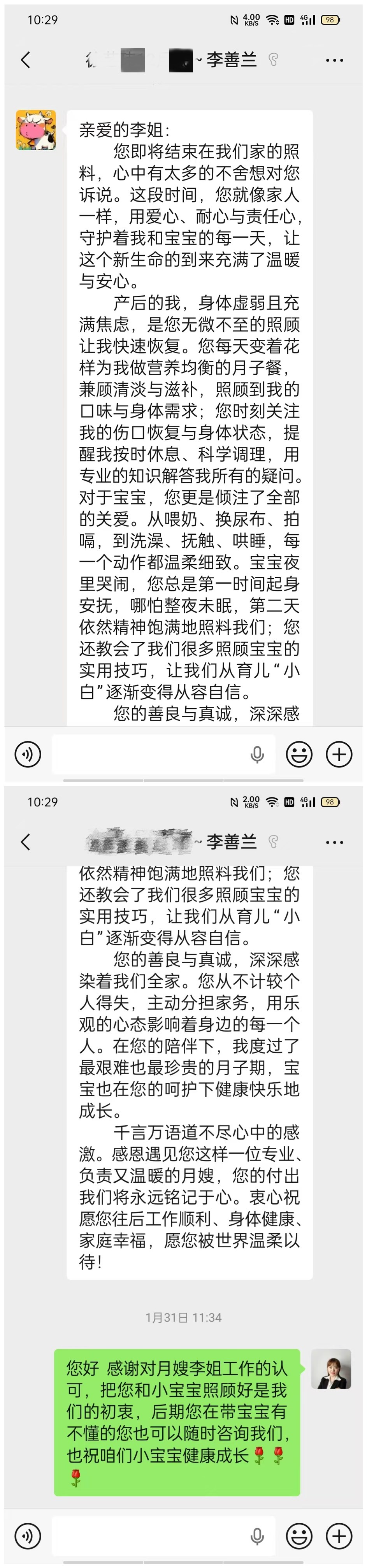 千言万语道不尽心中的感激。感恩遇见您这样一位专业、负责又温暖的月嫂,您的付出我们将永远铭记于心。衷心祝愿您往后工作顺利、身体健康、家庭幸福,愿您被世界温柔以待!