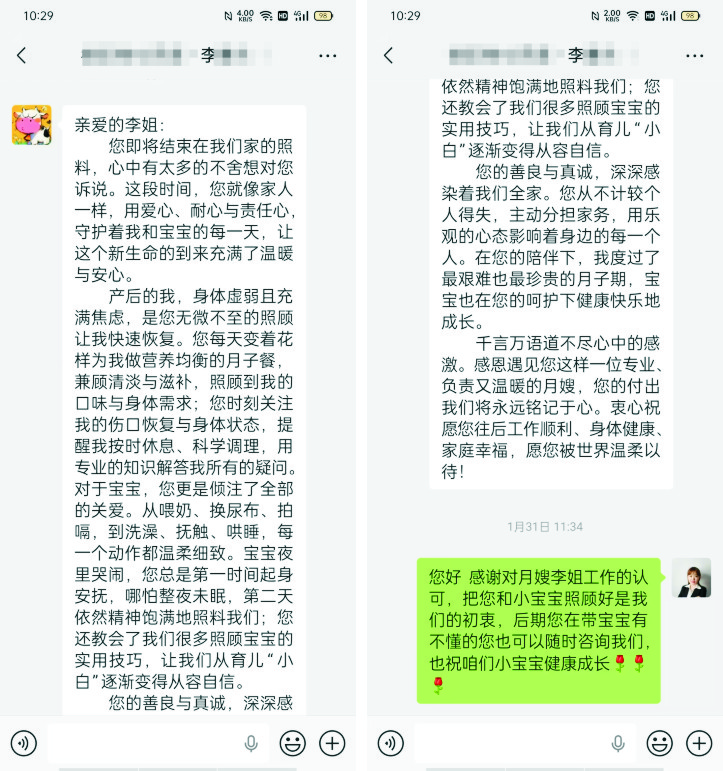 “这段时间,您就像家人一样,用爱心、耐心与责任心,守护着我和宝宝的每一天。”