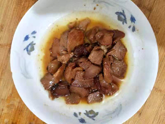 1、肉切厚片红烧备用。