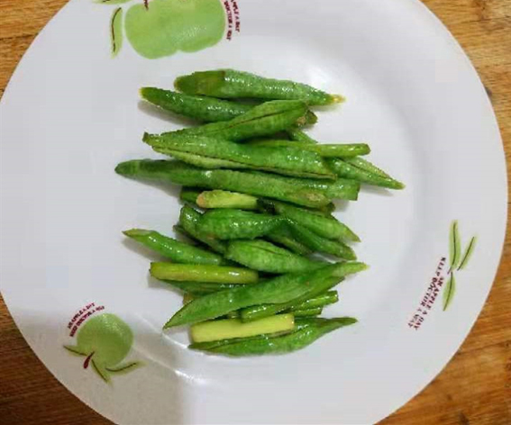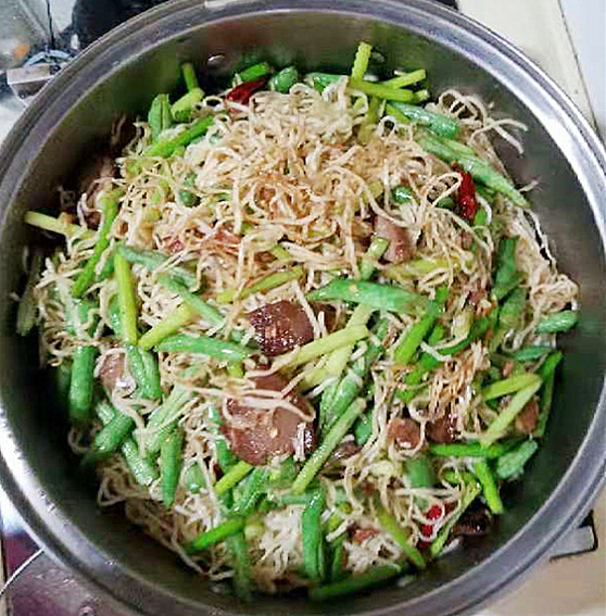 3、豆角、蒜台儿、烧好的肉炒到一起,炖几分钟,加入调料,和准备好的面拌匀。